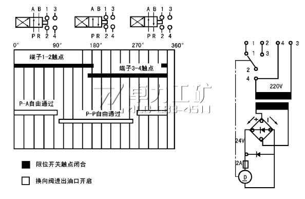24EJF-P型二位四通換向閥(40MPa)主要由直流電機(jī)、限位開關(guān)、換向閥體,整流變壓器裝置等元件安裝于同一底板上并置于防護(hù)罩殼內(nèi)組成。