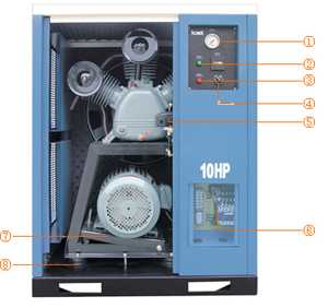 ◆方便調整裝置:為使產品科技化、合理化,特有的馬達梯形支撐結構,方便調整機頭與馬達之間V型皮帶的松緊度,使壓縮機充分發揮威力。