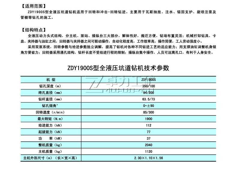 ZDY-1900S全液壓坑道鉆機(jī) 技術(shù)參數(shù)表