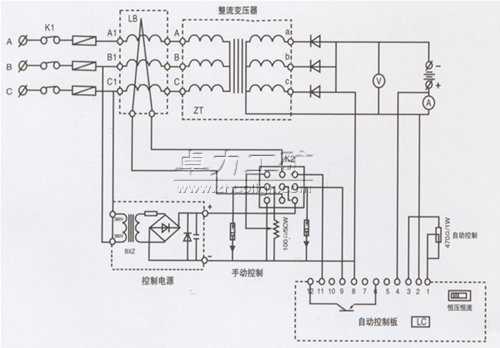當電網電壓波動或負載波動而引起輸出整流電壓波動時,通過改變飽和電抗器的電抗變化來達到穩定電壓的目的.由于礦燈充電電流是一個變化量,而電網電壓也是一個變化量.這二個量的不斷變化,使礦燈充電電壓同時作相應的變化,影響礦燈充電質量,影響礦燈充電質量,加入穩壓裝置后這個變化量從輸出斷a b 二點取出,與控制器內部的標準量進行精密比較,再經 C 點輸出一個自動調整的變化量.放大后自動控制直流激磁電流的變化,使輸出電壓保持在整定值5±1%的范圍內,達到自動穩壓的目的.