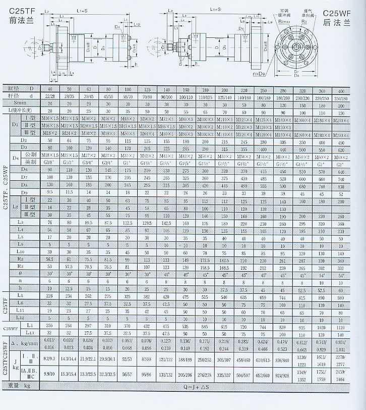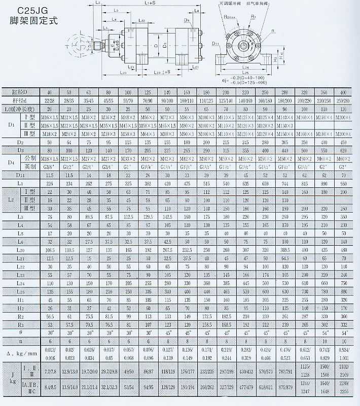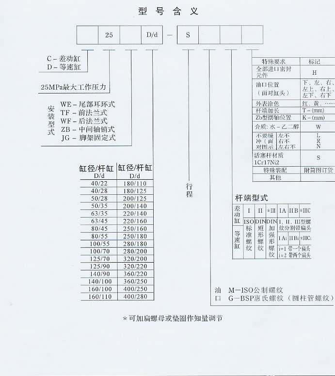 ·型式規格齊全:共16個缸徑規格,各有2×8個裝配型式,組成256個品種。液壓缸為雙作用單活塞型式,有差動缸和等速缸之分,帶可調緩沖(或不帶),亦可配防護罩。